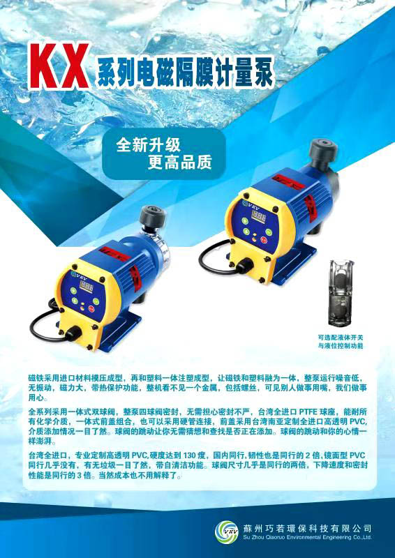 KX系列電磁計(jì)量泵是由微處理器控制、短沖程、電磁驅(qū)動(dòng)的隔膜型計(jì)量泵。VKV系列計(jì)量泵以其、地性能、優(yōu)越的性?xún)r(jià)比多年來(lái)受到廣大用戶(hù)的一致好評(píng)。由于泵頭材質(zhì)具有良好的耐化學(xué)腐蝕性能,因而可以對(duì)各種工藝過(guò)程中幾乎所有化學(xué)液體進(jìn)行計(jì)量。